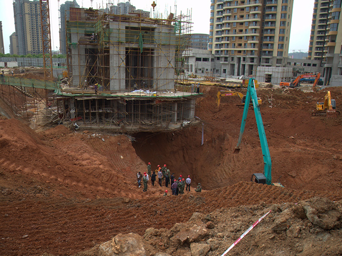 5月2日上午10時50分,江夏區(qū)文化大道江南新天地一在建樓房工地發(fā)生地面塌陷事故,兩名工作人員和一臺勘察鉆機被埋。我院受市建委委托,在肖建華院長的指示下,迅速組織地災(zāi)、物探等相關(guān)專業(yè)專家,組成應(yīng)急救援隊伍,數(shù)次奔赴現(xiàn)場參與應(yīng)急救援工作。