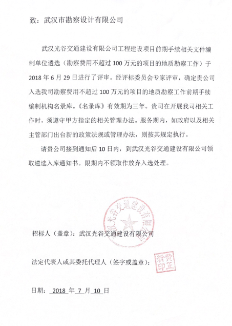 2018年6月29日,經(jīng)投標(biāo),我公司成功入選武漢光谷交通建設(shè)有限公司“勘察費(fèi)用不超過(guò)100萬(wàn)元的項(xiàng)目地質(zhì)勘察工作”,服務(wù)期限為三年。