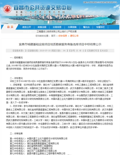 2018年7月13日,我公司以優(yōu)良的信譽、合適的報價,從14家勘察單位中脫穎而出,成功入選宜昌市城建基礎設施項目地質(zhì)勘察服務商備選庫,本次服務商備選庫擇優(yōu)選取前七名候選人,服務期三年。招標人為宜昌市住房和城鄉(xiāng)建設委員會。服務工作范圍主要為宜昌市城建...